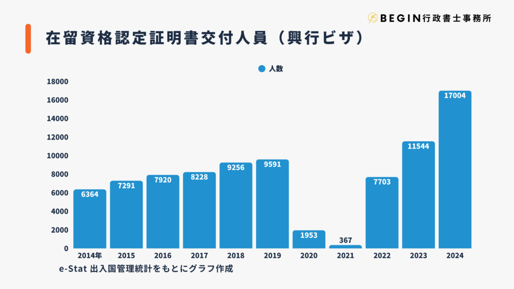 興行ビザは韓国からの呼び寄せが多い=審査側・申請側ともに案件の型が成熟していることを意味します。